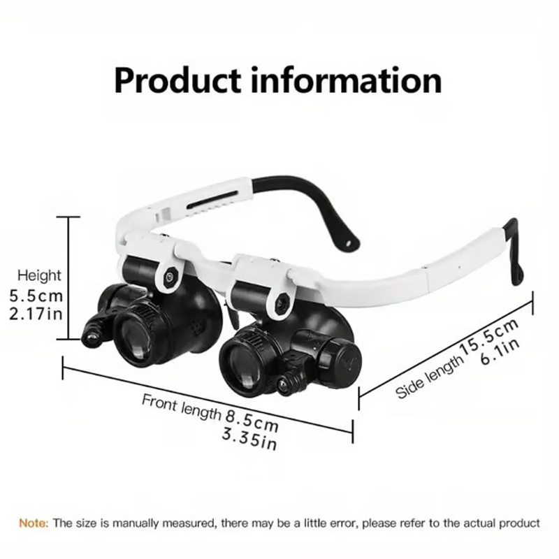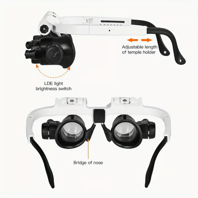 The loupes are mounted on the black eyeglass frames and can be adjusted for comfort while keeping your hands free.