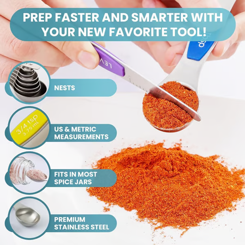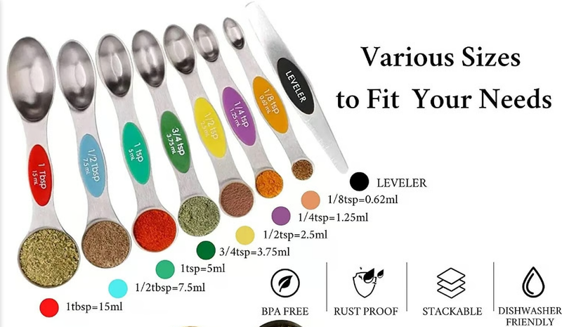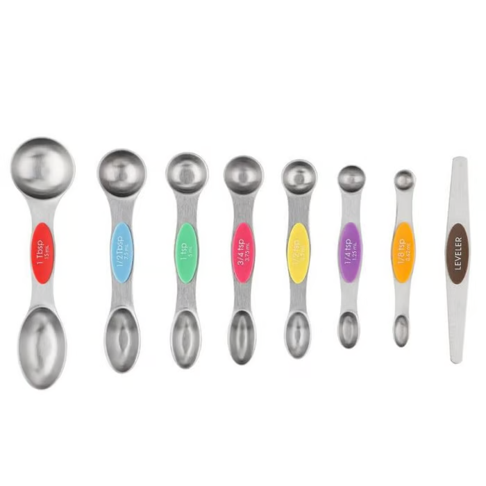 Our Kitchen Gadgets Set, complete with 8 pieces including 7 magnetic measuring spoons, 1 leveler. This comprehensive set provides all the essential measurement tools you need in the kitchen.