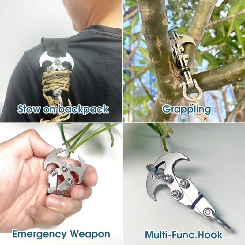 Our hook is an essential tool that can be used for everything from opening bottle caps to being used as an emergency weapon. With a strong rope, you can use it in a variety of scenarios, including camping, hunting, pulling cars, and more.